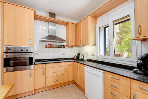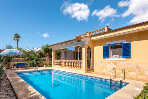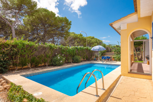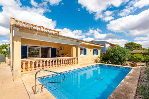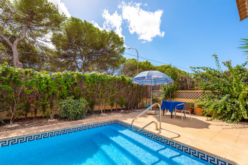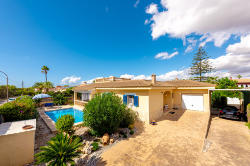 The outdoor area is designed for relaxation and enjoyment: a covered veranda, which can also be used in winter, leads directly to the private swimming pool (8 x 4.5 m) with outdoor shower and sun terrace. The well-maintained garden with lemon trees, ornamental plants, and two storage rooms adds to the Mediterranean charm. A carport for two vehicles is available, and the entire property is securely fenced.