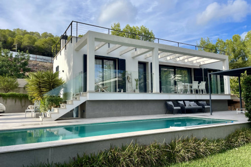 Set on a 1,554 sqm plot with 612 sqm of built space, the main villa offers 5 bedrooms, 4 bathrooms, and a high-quality fitted kitchen with Siemens appliances. Underfloor heating with a heat pump, central air conditioning, and a stylish fireplace ensure year-round comfort. An absolute highlight is the completely separate guest house with 2 bedrooms, 2 bathrooms, its own pool, and a parking space – perfect for guests or rental, offering maximum privacy.