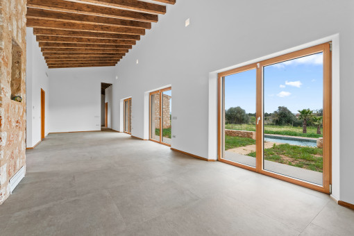 The single-storey finca, with approx. 235 sqm of living space, was created as a heartfelt project and impresses with its traditional, well-thought-out construction. The layout clearly separates living and sleeping areas, while the open-plan living, dining and kitchen area flows seamlessly. Large windows open to the south onto the terrace, garden and pool. The covered porch provides an ideal transition between indoor and outdoor living, allowing year-round enjoyment. The plot of approx. 16,341 sqm is fully enclosed.