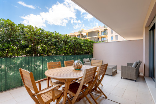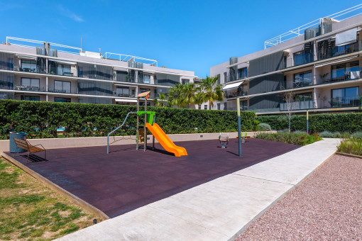 This beautiful ground-floor apartment is part of a residential complex built just 5 years ago, located in a მშვიდ and quiet area on the outskirts of Palma, only a 10-minute drive from the city center. It is also very close to Palma Airport. This residential neighborhood also offers all the services you may need, such as supermarkets and public transport.