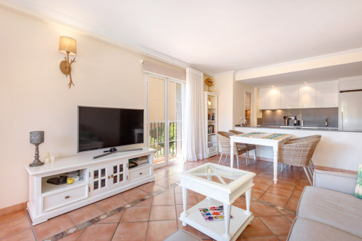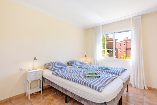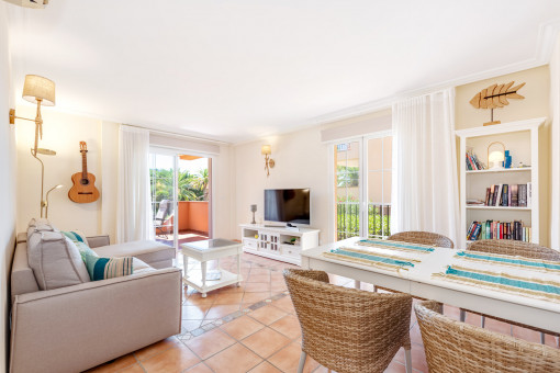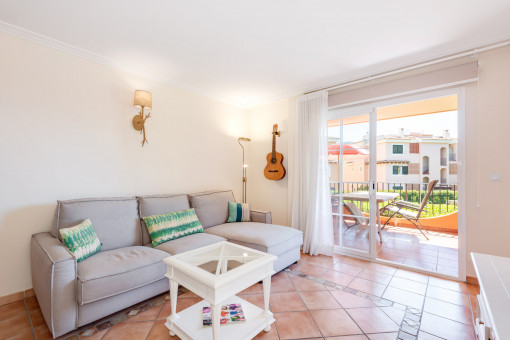 The apartment offers a total of 83 sqm of constructed interior space, comprising two bright bedrooms with built-in wardrobes, two bathrooms, and an open-plan living and dining area with an integrated kitchen. Large windows provide plenty of light and create a cozy atmosphere with typical Mallorcan style.