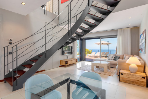 The lower floor offers 4 further bedrooms - each with its own en suite bathroom - another kitchen and a second living/dining area. From every room you have direct access to the spacious pool terrace with its large saltwater pool, where the glistening sea and the gentle sound of the waves create the perfect vacation atmosphere.