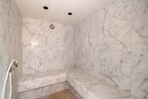 On the first floor there is a spacious, open-plan area with kitchen, living room and dining room, high ceilings and lots of light. There is a guest WC and a hallway leading to 3 large bedrooms, each with its own bathroom. From this floor there is access to the spa area with showers, Turkish bath and sauna.