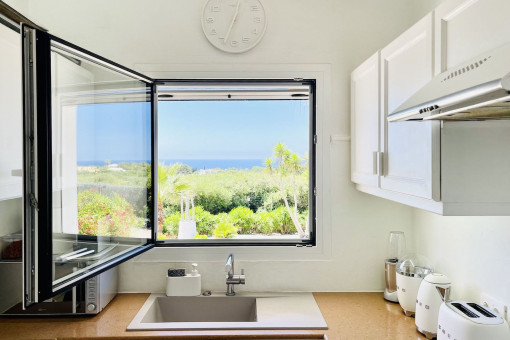 The house was built in the Menorcan style and is very bright and has air conditioning with dehumidification function in the living room. The bedrooms, living room and kitchen are equipped with ceiling fans. The windows are made of aluminum with double glazing and the shutters are made of wood.