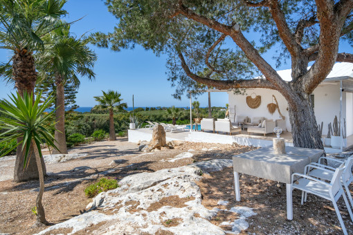 This single-storey architect-designed finca has 3 bedrooms, 2 bathrooms (one en suite), an open-plan living, dining and kitchen area, 3 covered terraces and a large terrace with pool. The sea view is omnipresent from all rooms of the house as well as from the pool and the terraces.