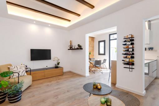 The apartment offers approx. 88 sqm of constructed interior space and impresses with an open-plan living and dining area with an integrated kitchen. Two bedrooms, a large bathroom, and a guest toilet ensure comfort. High barrel-vaulted ceilings with indirect lighting and a stylishly designed Marès stone wall give the living area a wonderfully Mallorcan character. Fully renovated five years ago and very well maintained, the property combines Mediterranean charm with modern living comfort.