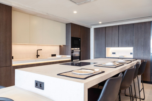 On the same level there is a covered terrace of 17.10 sqm offering side-views of the sea, and a further terrace of 55 sqm which has access from the kitchen.