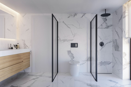 On the ground floor of the building are the communal areas offering diverse zones to relax in the sun including the pool, the garden and in the bright fitness centre. There are 2 lifts and everything is designed practically and luxuriously. For every apartment there is a choice of 3 differing interior equipment-designs so that you can further personalise your own style. For example, there are porcelain stoneware or harz-wood floors, sanitary fittings of titan or stainless steel, and white or dark-coloured kitchens.