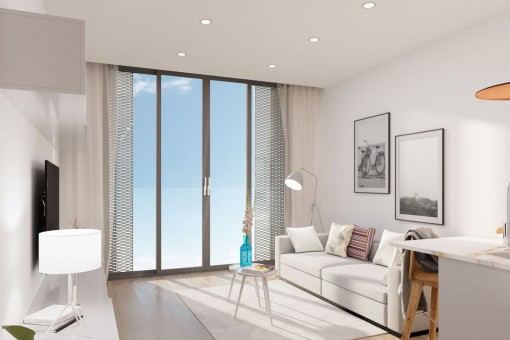 An internal staircase leads to the second part of the property with a fitted kitchen with adjoining, open living/dining area, and a further bedroom with its own balcony. An absolute highlight is the private sun terrace with its own pool and ample space for terrace-furniture.