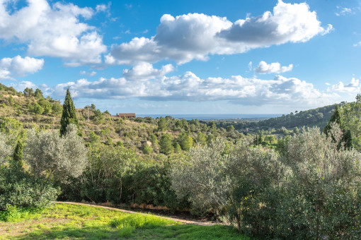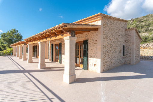 An impressive driveway leads to this luxurious finca, whose spacious entrance area leads into an open, light-flooded living and dining area. A modern kitchen, which is complemented by a large, tiled food storage room and a "mise en place", as well as a cozy fireplace create a perfect combination of functionality and comfort. The high ceilings with exposed wooden beams give the rooms a typical Mallorcan flair. From the living area you enter a covered terrace that offers spectacular views of the sea and the Calas de Mallorca.